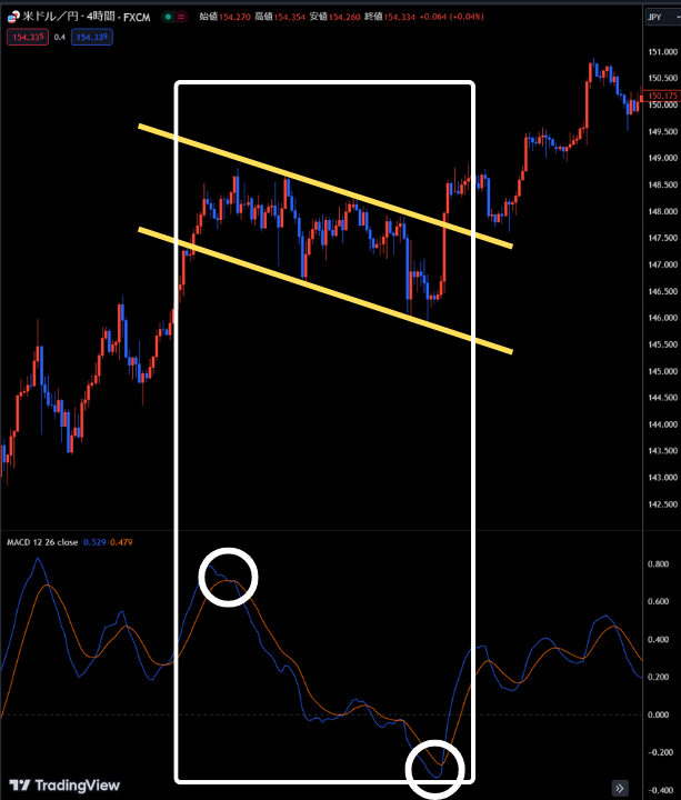 先程の移動平均線同様に、MACDのゴールデンクロスとデッドクロス、傾きを見ることでフラッグの出現からブレイクまでを認識しやすくなります。