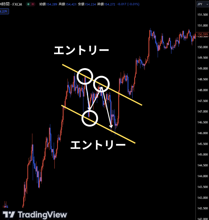 フラッグはラインブレイクするまでフラッグ内を行ったり来たりすることから、ラインの往復を狙うトレードが行えます。