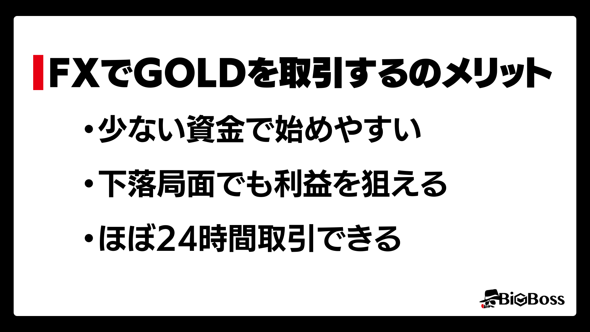 FX業者を使ったゴールドのCFD取引には、以下のようなメリットがあります。