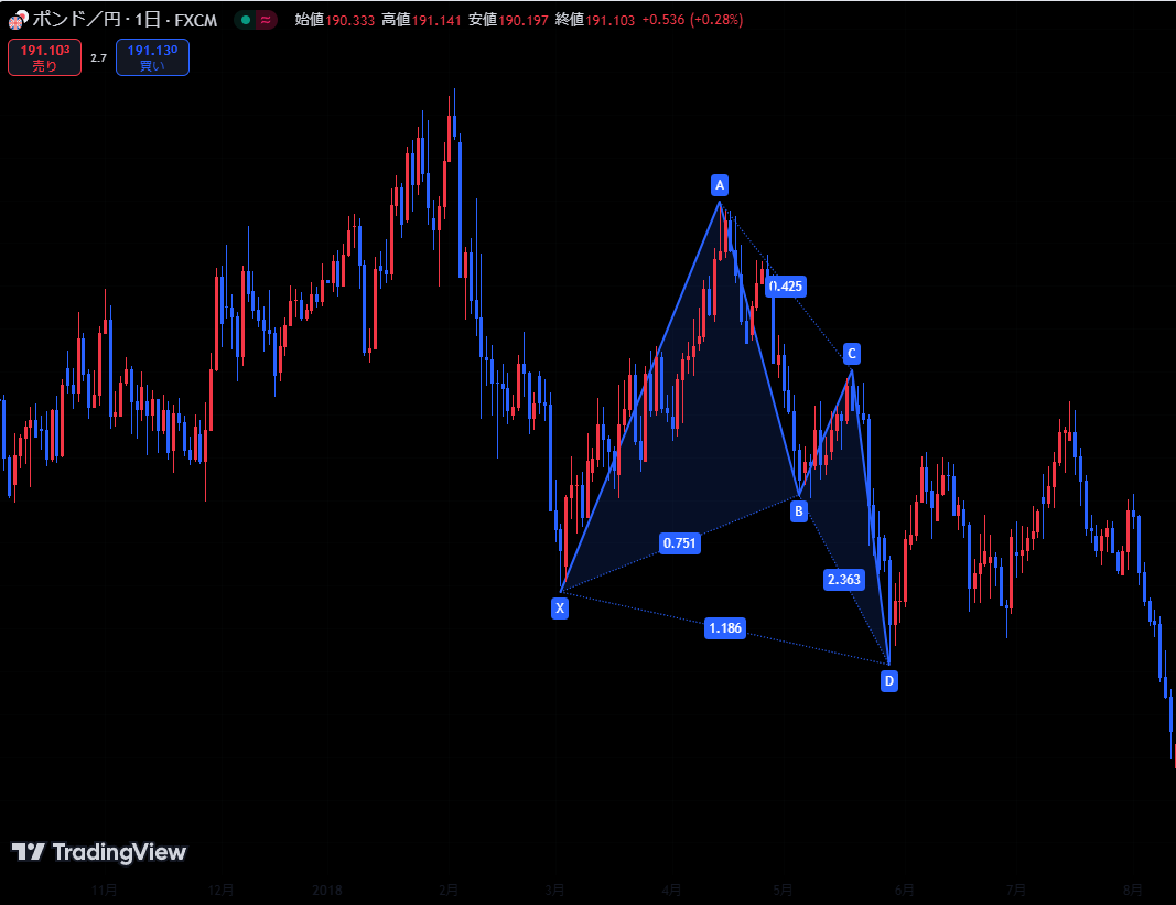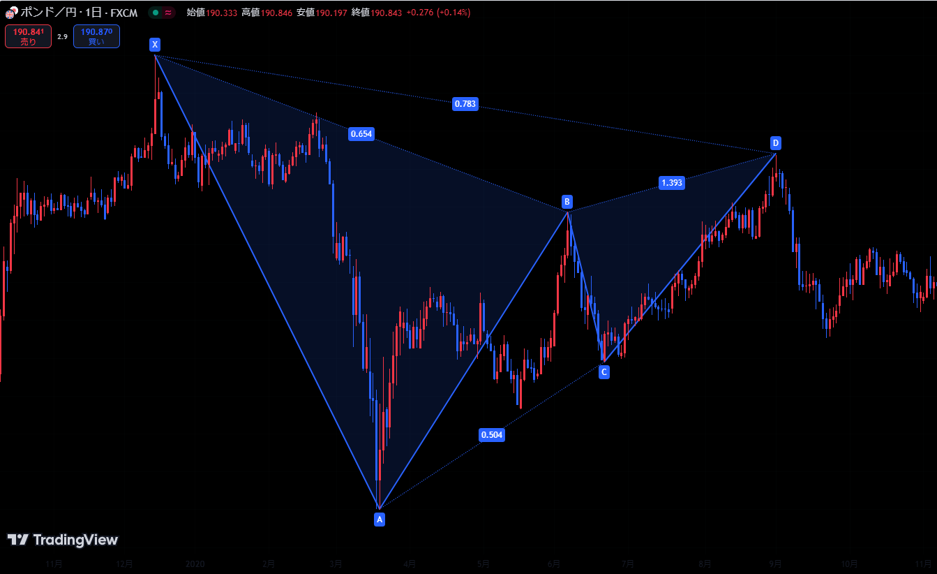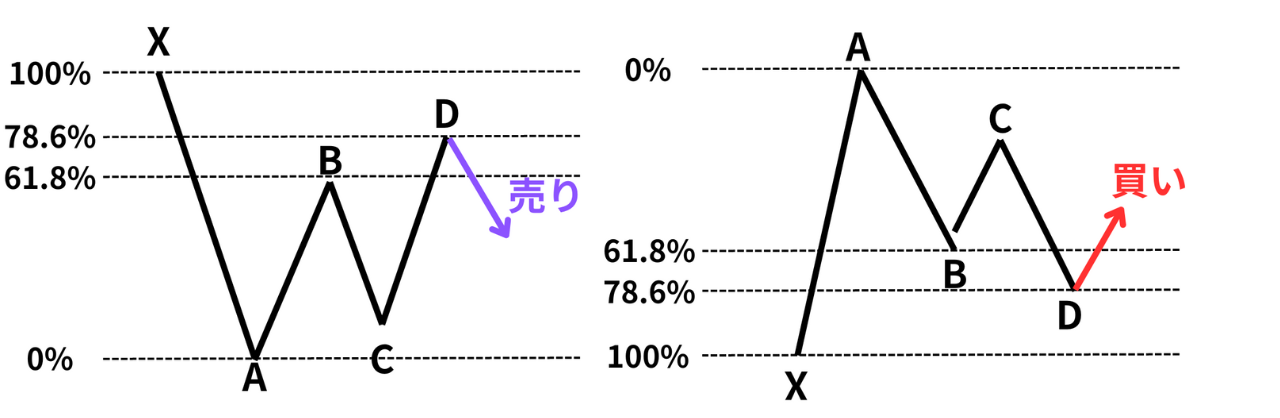 バットは、ガートレーと似ている形状ですが、XAに対してBが38.2~50%、Dが88.6%の価格帯に位置する点が異なります。