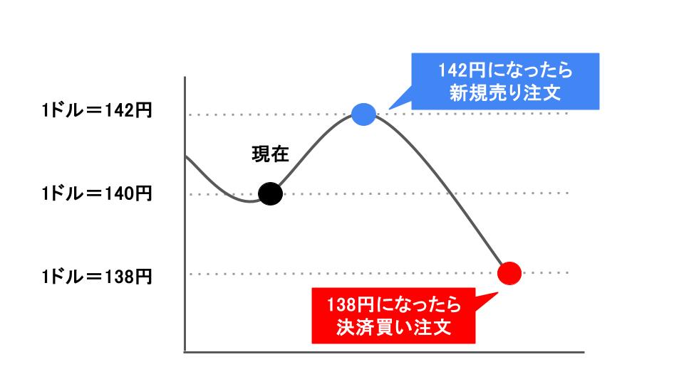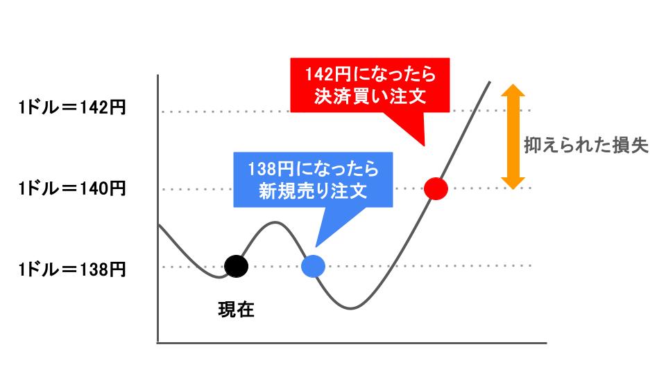 例えば、下図のように1ドル142円まで価格が上昇したら新規の買い注文、138円に下がったら売り注文によって損切りが実行されるように、逆指値注文を入れる方法があります。