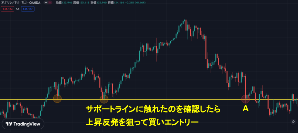 水平ラインの反発を狙う際は、下図のように価格が下落してサポートラインに触れたとき(A)に上昇反発を狙って買いエントリーをするのが有効です。