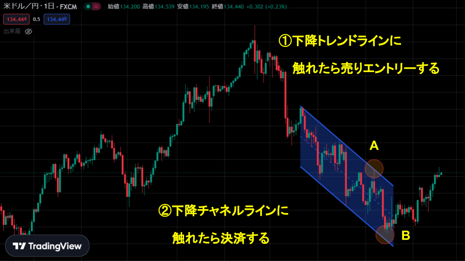 下図のように、トレンドライン(A)で売りエントリーし、チャネルラインの底(B)で決済すると利益を得られます。