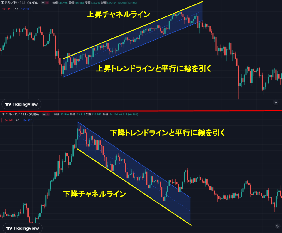 下図のように、上昇トレンドラインと平行に引く線を「上昇チャネルライン」、下降トレンドラインと平行になるように引く線を「下降チャネルライン」といいます。