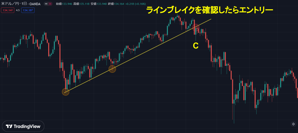 下図のように、上昇トレンドでラインブレイクが起こったタイミング(C)は、下降トレンドへの転換が予想されるため、売りエントリーをすると利益を狙える可能性があります。