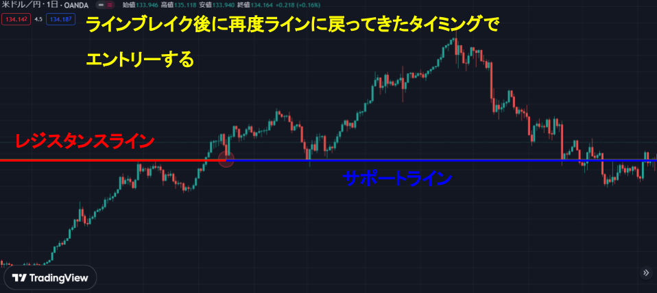 レジサポ転換を予測する場合は、ラインブレイクをしたあとに再度ラインの近くに戻ってきたタイミングでエントリーするのが有効です。