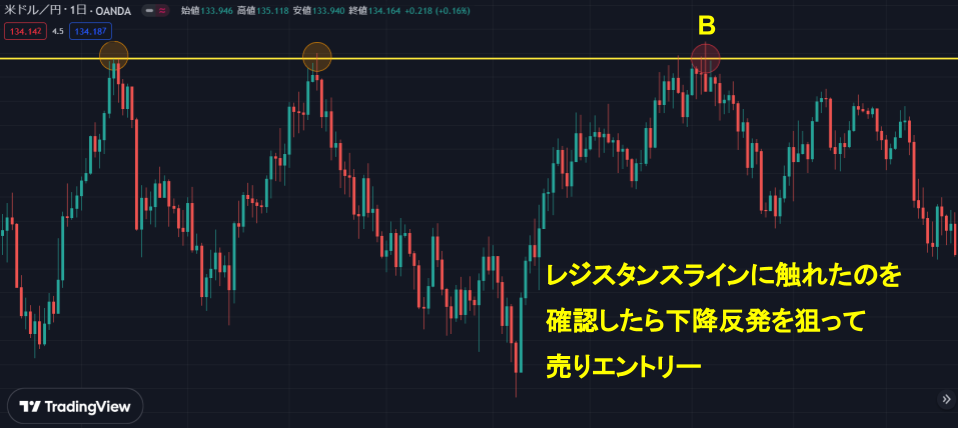 一方、レジスタンスラインの場合は、Bのポイントで下降反発を狙って売りエントリーをするのが良いでしょう。