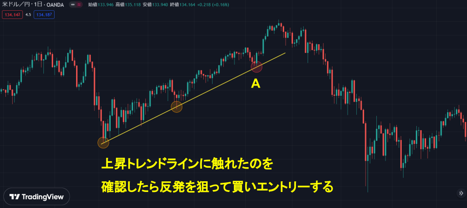 トレンドラインの反発を狙う場合は、下図のように為替レートが上昇トレンドラインまで下がったとき(A)に買いエントリーをします。