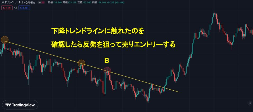 下降トレンドラインの場合は、為替レートが下降トレンドラインまで上がったとき(B)に売りエントリーをします。