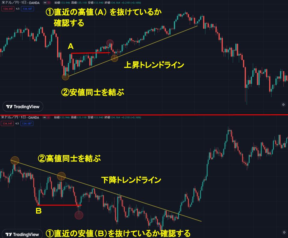 いずれのトレンドラインも引く前に、ローソク足が直近の高値・安値を抜けているかを確認することが大切です。