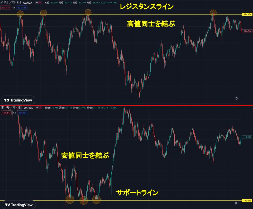 これらのラインは、下値を支えるサポートライン、上値を抑えるレジスタンスラインとも呼ばれます。