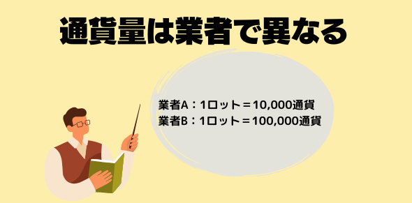 1ロットあたりの通貨量は、FX業者によって異なります。