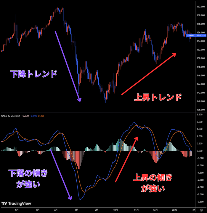 MACD線とシグナル線の傾きからトレンドの強さを把握することができます。