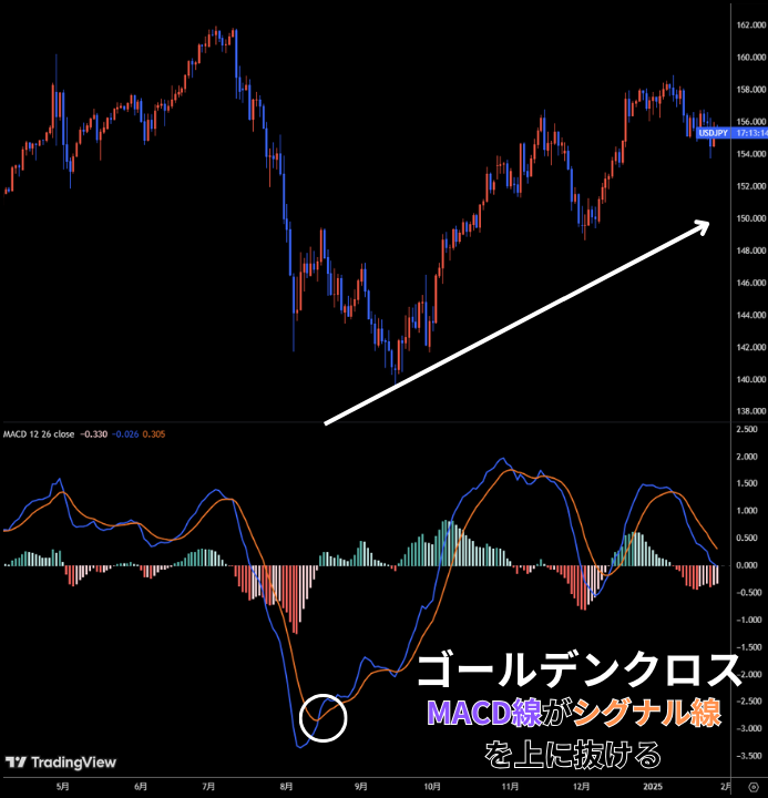 ゴールデンクロスとは、MACD線がシグナル線を下から上にクロスするサインのことです。