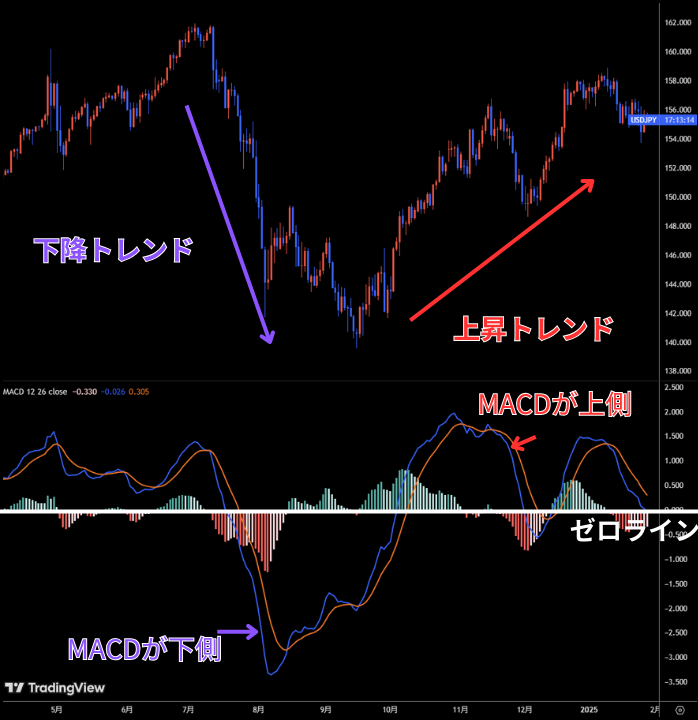 中央のゼロラインとMACDの位置関係を見れば、トレンドの強さを把握できます。