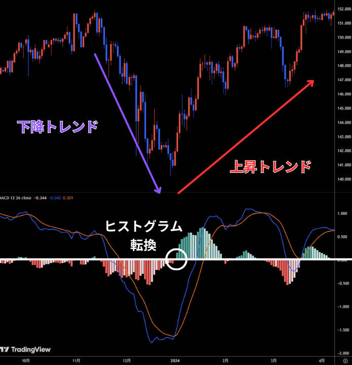 MACD線とシグナル線の交差やヒストグラムの転換によって、トレンド転換のポイントを予測できます。