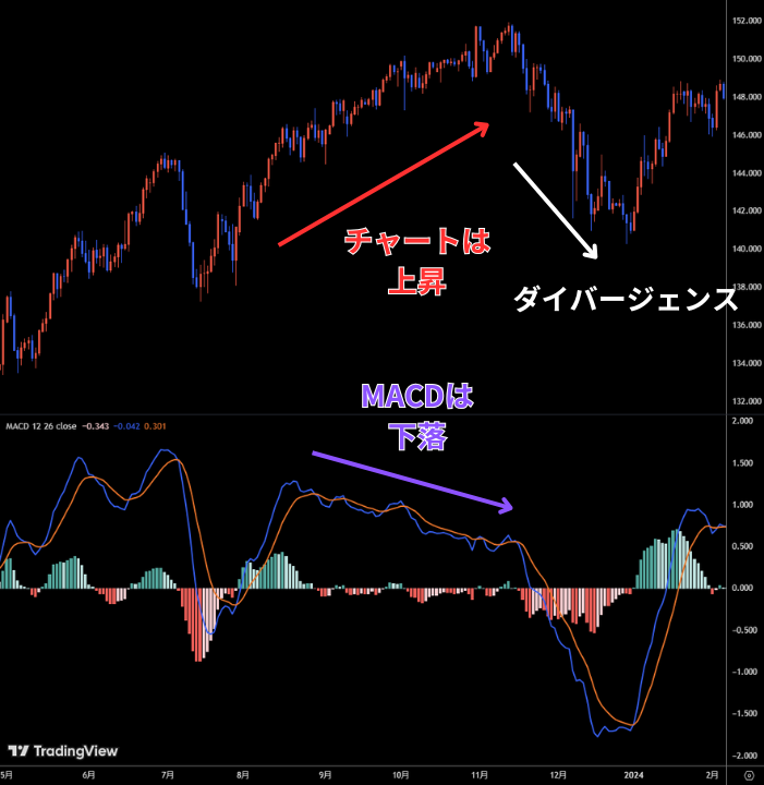 ダイバージェンスとは、価格レートとMACDが逆行する現象のことです。