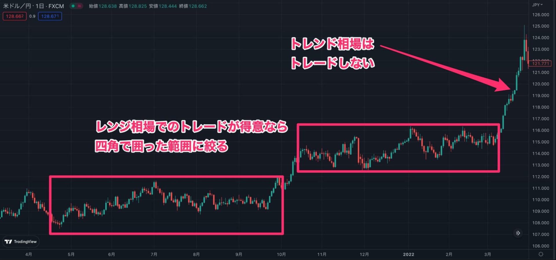 しかし、トレンド相場については積極的に取引する必要はありません。なぜなら、苦手な相場の時にトレードしても良い結果を得られない可能性が高いからです。
