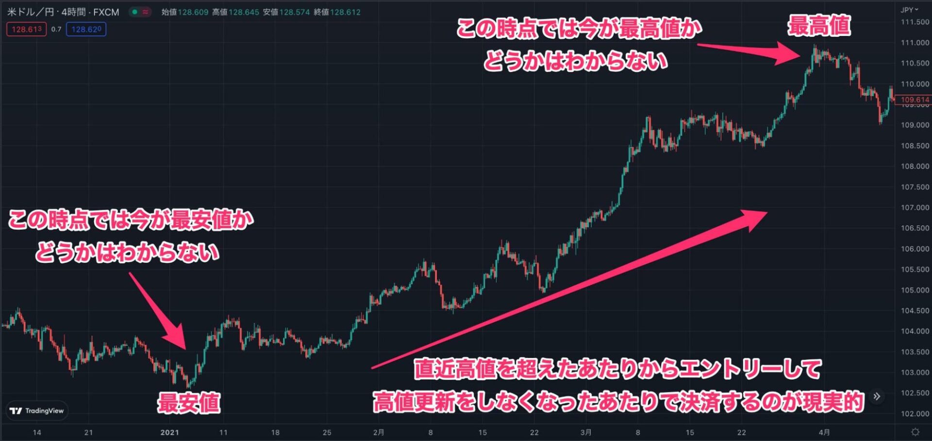 米ドル/円のチャート(2021年1月から4月)を例に解説します。