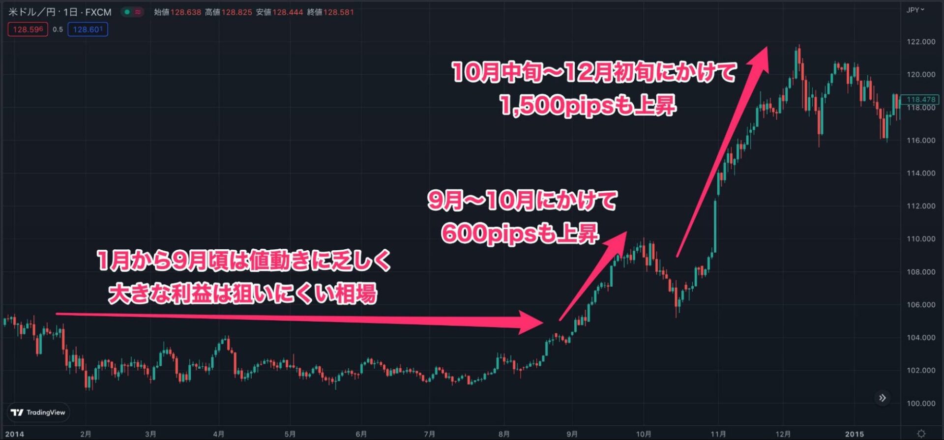 しかし、9月頃から10月の頭にかけて600pips、さらに10月中旬から12月にかけては1,500pipsも上昇しました。