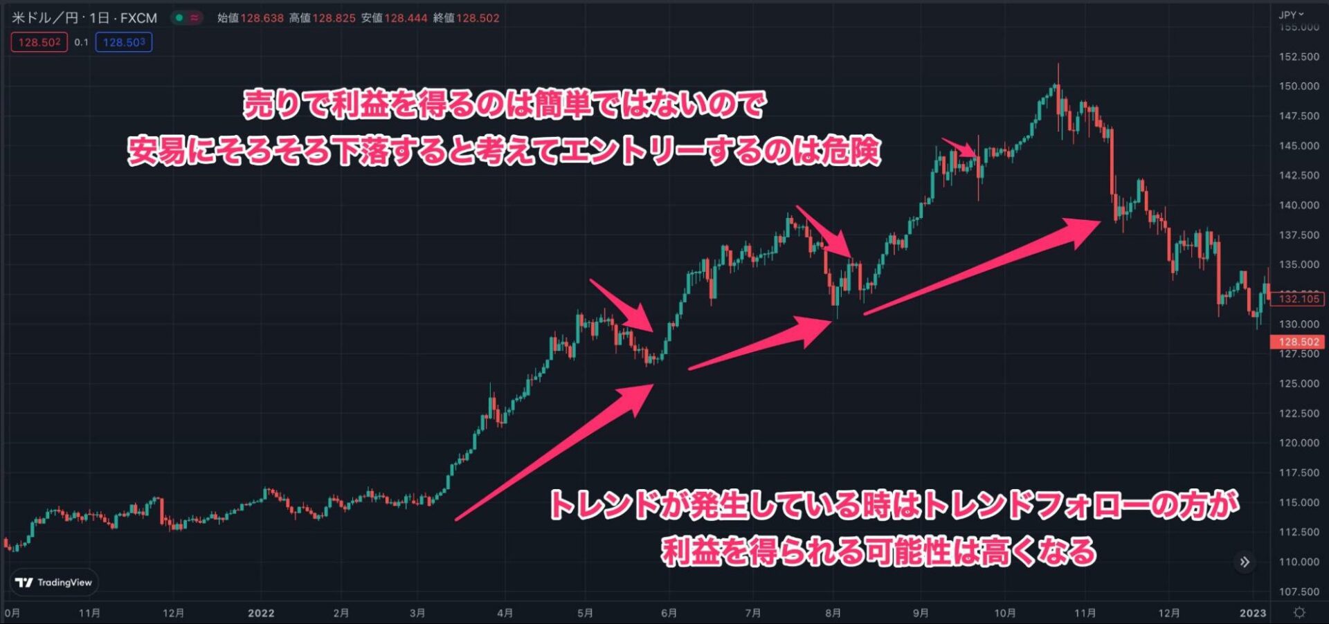 2022年3月頃から11月頃まで続いた歴史的なドル高円安相場は、ブル派(買いたいトレーダー)にとっては大きなチャンスでした。