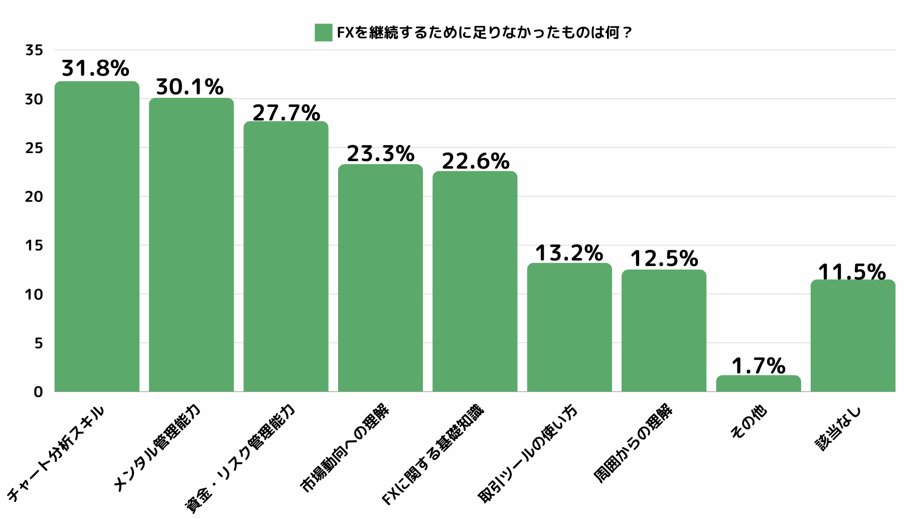 2024年に株式会社アドバンが行った調査で「FXを継続するために足りなかったもの」について質問したところ、最も多かった回答は「チャートを読む・分析するスキル」が31.8%、次いで「メンタル管理能力」が30.1%、3番目に「資金管理・リスク管理の知識」の27.7%という結果が出ました。