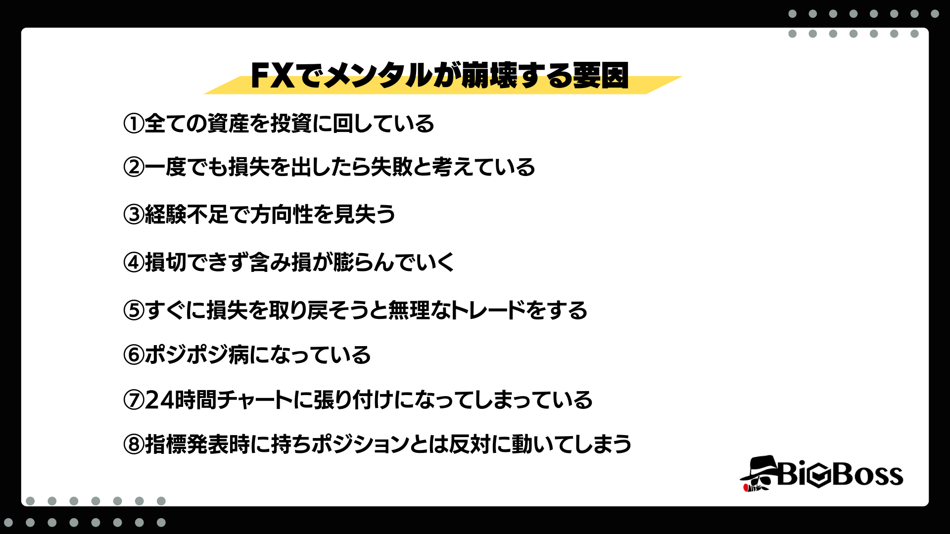 闇雲にポジションを持ってしまうため損失を出しやすく、損失を出すたびにメンタルが削られていきます。
