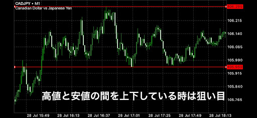通貨ペアはだいたいどれも、このような値動きを繰り返しているものです。値動きが小さいのでなかなか利益が出ないという場面は、値が大きく動く前兆であると捉えてポジションを建てておくことをおすすめします。