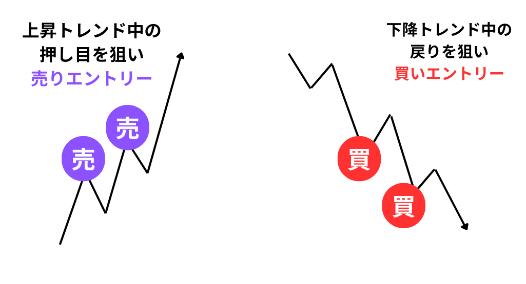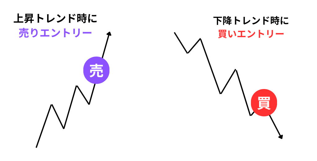 FXトレードでは、下図のように上昇トレンドで売りエントリー、下降トレンドで買いエントリーすることを指します。