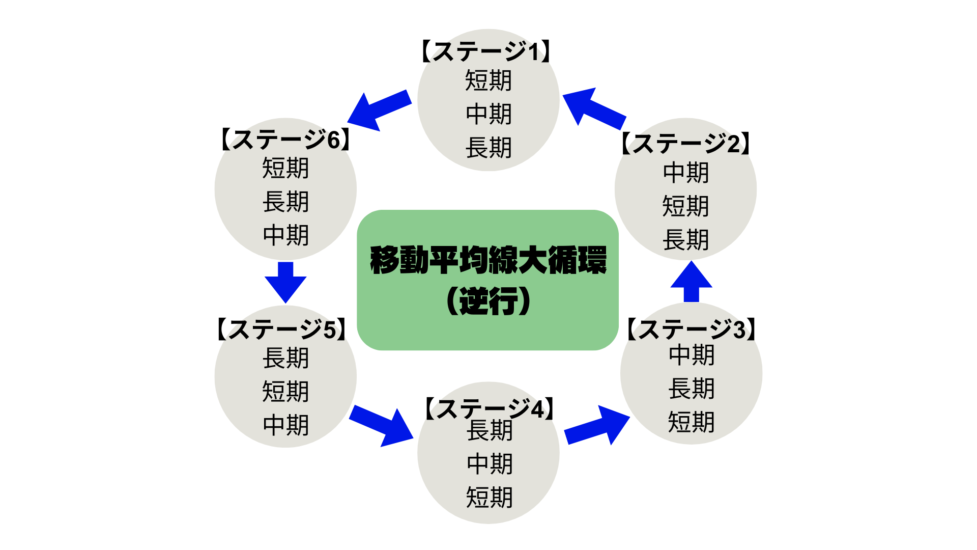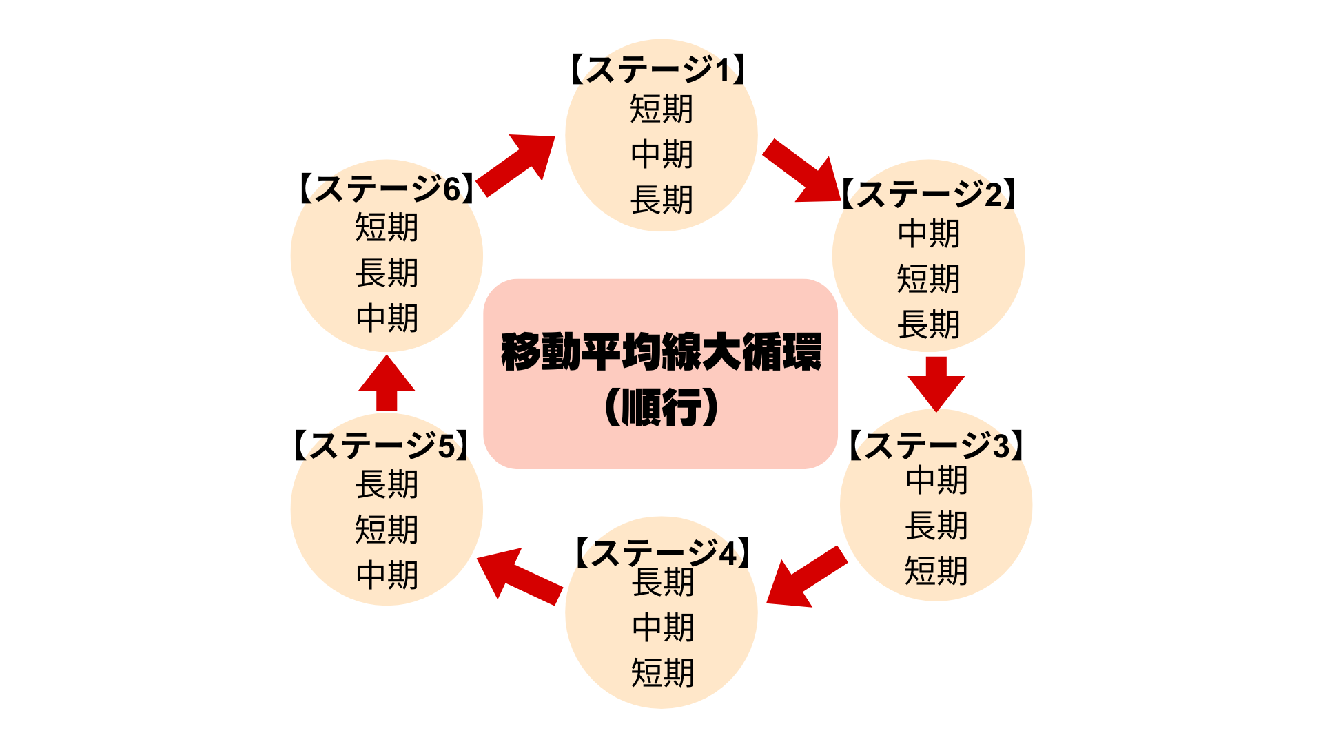 仮にパーフェクトオーダーの状態をステージ1とし、その他の並びを以下のように示すとステージ1~6を順に繰り返しながら価格は変動していくとされています。