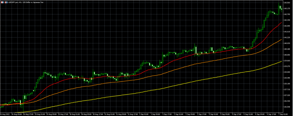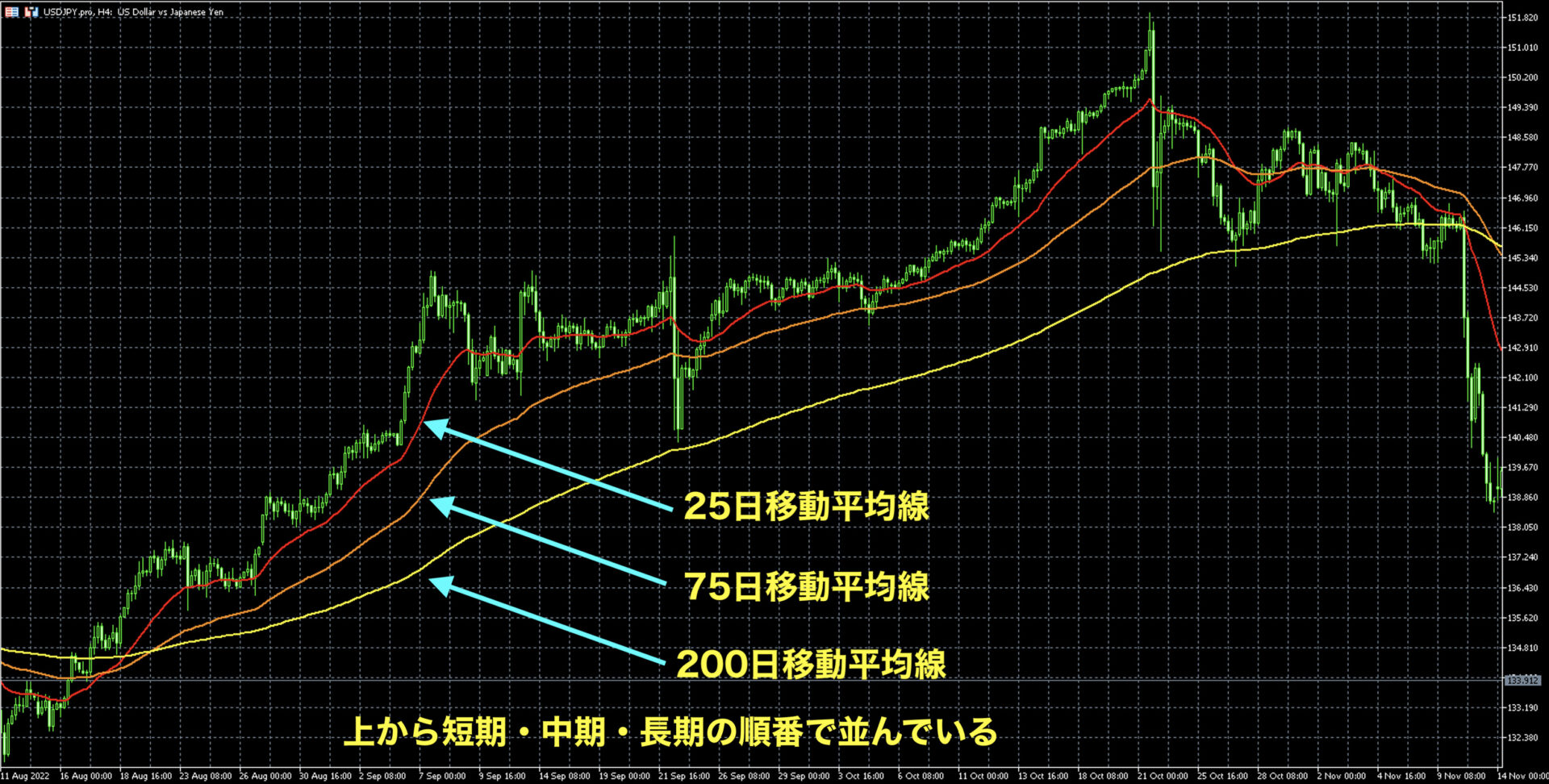 FXのパーフェクトオーダーとは、3本の移動平均線が短期・中期・長期の順番で並んでいる状態です。