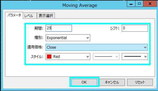 種別は、Simple(SMA)よりもExponential(EMA)の方がおすすめです。