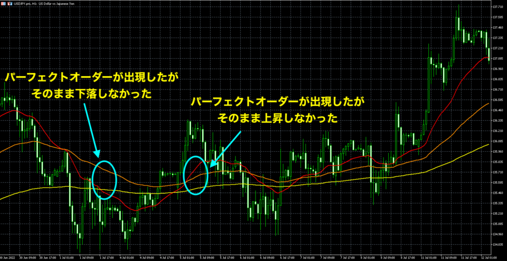 パーフェクトオーダーでトレードする際はいくつか注意点があります。