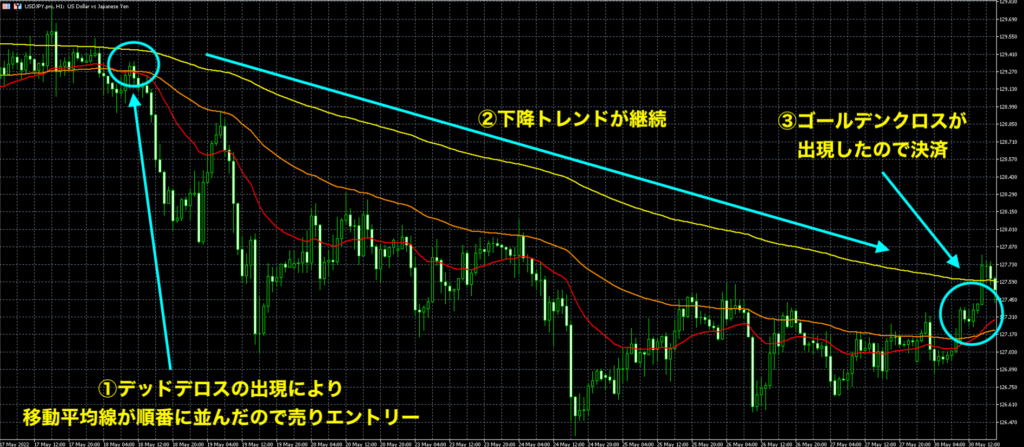 まず、以下のチャートにもあるように、デッドクロスの出現を待ってみましょう。そして、移動平均線が上から長期・中期・短期の順番になったら売りエントリーをします。