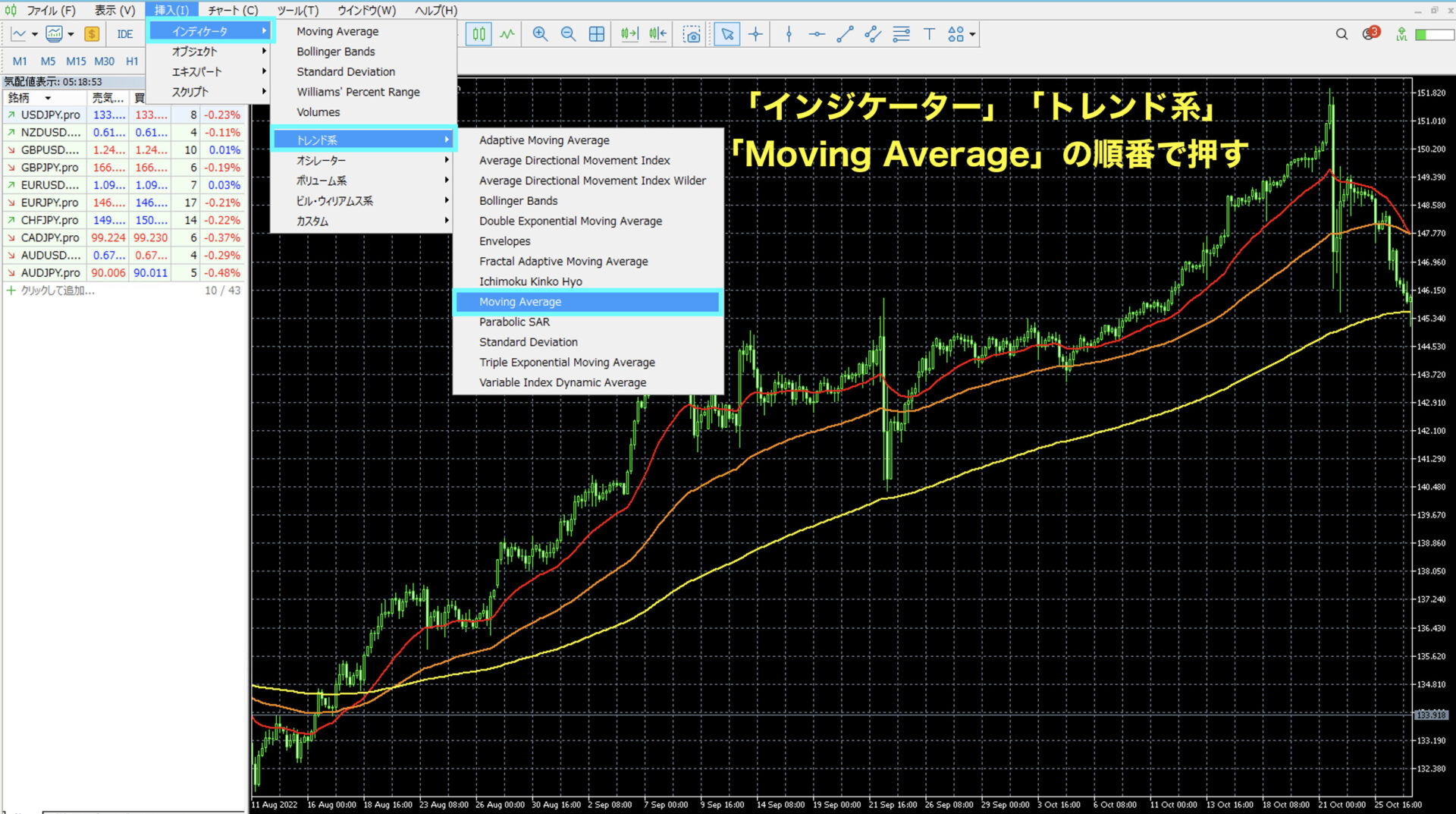 「インジケーター」「トレンド系」「Moving Average」の順番で押していきましょう。