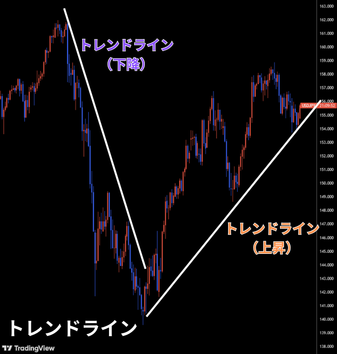 トレンドラインとは、相場の方向性を視覚的に認識しやすくするためにチャート上に引く線のことです。