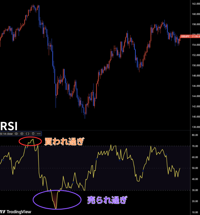 下図のように、RSIが70%以上の場合は買われ過ぎ、逆に30%以下の場合は売られ過ぎの相場と判断できます。