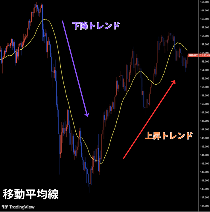 下図のように、移動平均線が下向きであれば下降トレンド、上向きであれば上昇トレンドと判断できます。