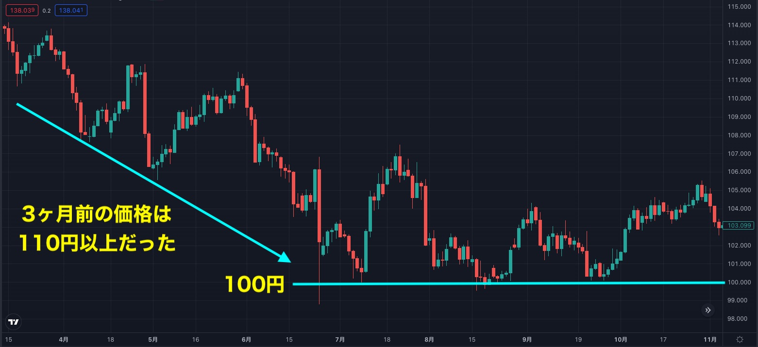 下図のチャートでは、3ヶ月前まで110円以上で推移していたことがわかるため、現在の100円は下落し続けて到達した価格であると判断できます。