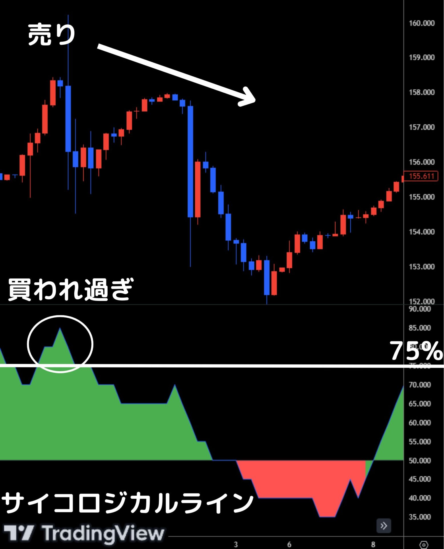 サイコロジカルラインが75%以上を示すときは、買われすぎであると判断できるため、売りエントリーをするのが効果的です。