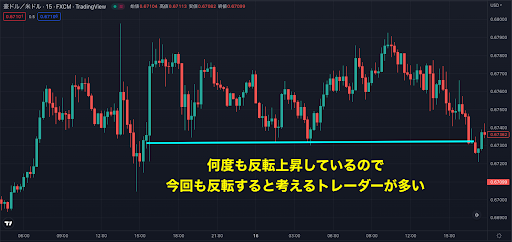 ラインを引いた箇所では何度も反転上昇していることから分かるように、多くのトレーダーが意識しているポイントです。