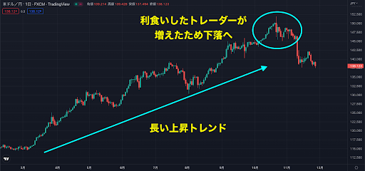 以前から買いポジションを保有しているトレーダーは、そろそろ利確したいと考え始めます。