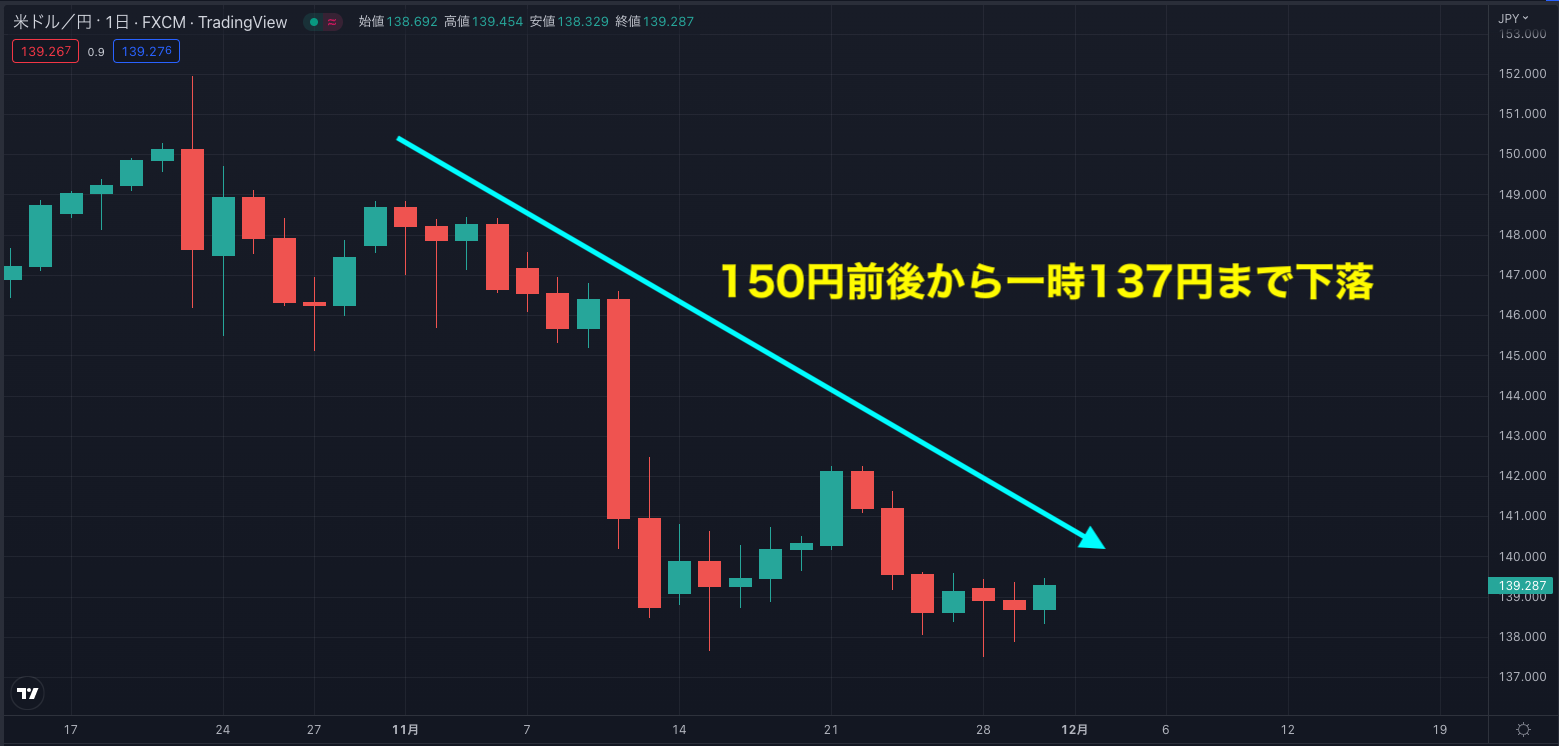 しかし、2022年11月28日時点ではその後の値動きは大方の予想に反しており、137円台まで下落しています。