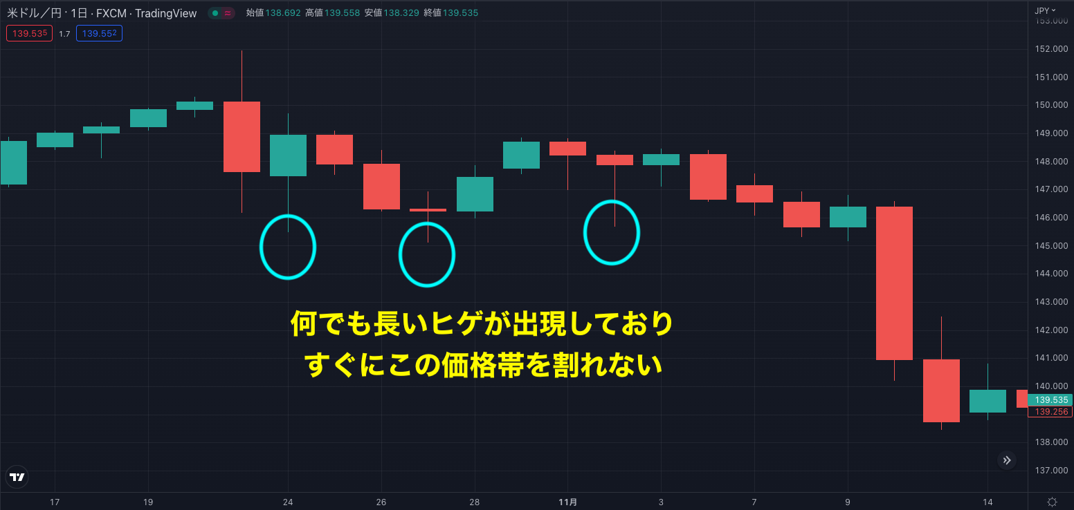 チャートを見ると、ヒゲの長いローソク足がいくつもある価格帯があります。