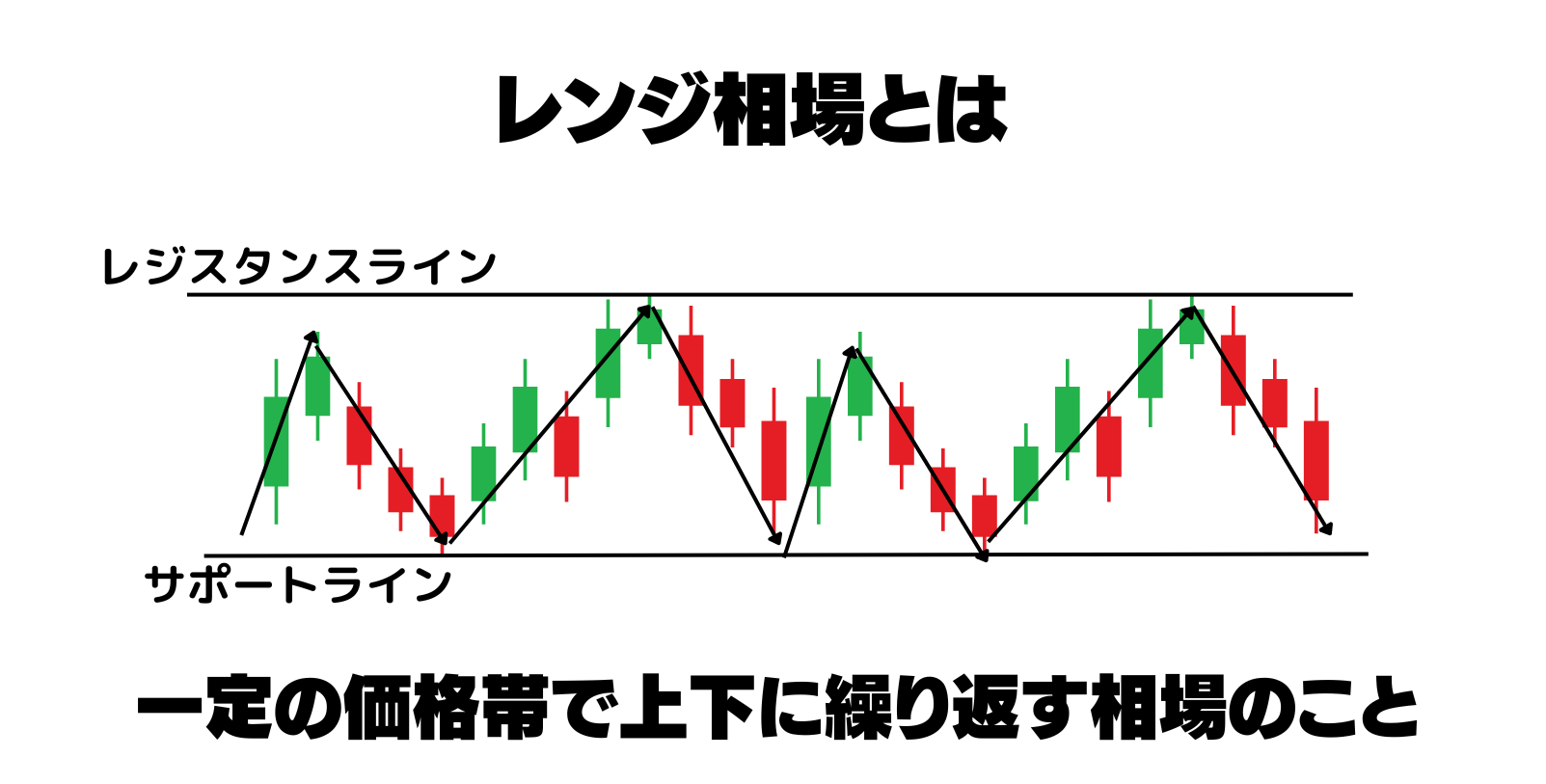 レンジ相場とは、一定の価格帯でチャートが上がったり下がったりを繰り返す相場のことです。