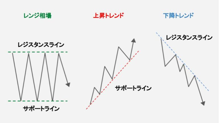 サポートラインが上向きであれば上昇トレンド、レジスタンスラインが下向きであれば下降トレンドと見分けられます。