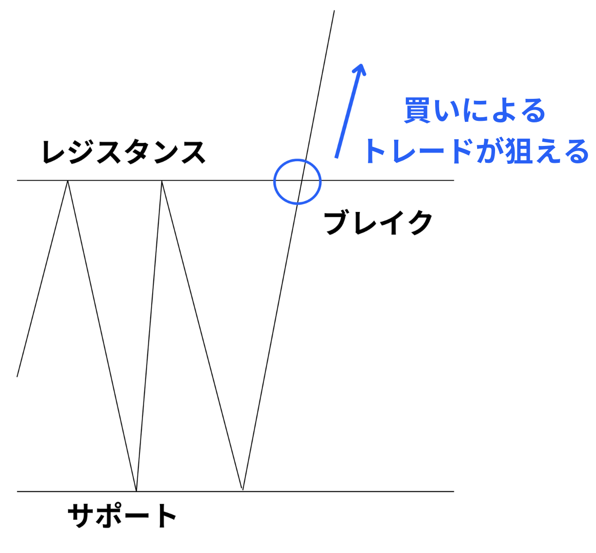 下図のようにレジスタンスラインを突破した場合は、上昇トレンドの発生が予測できるため、買いエントリーを入れるのが効果的です。