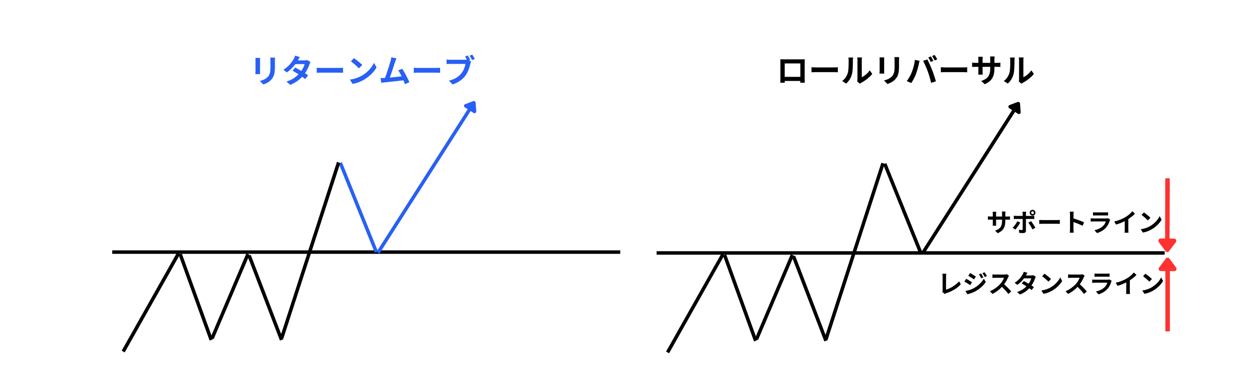 リターンムーブはラインブレイク後のチャートの動きに着目し、ロールリバーサルはラインブレイク後のラインの機能に着目しています。