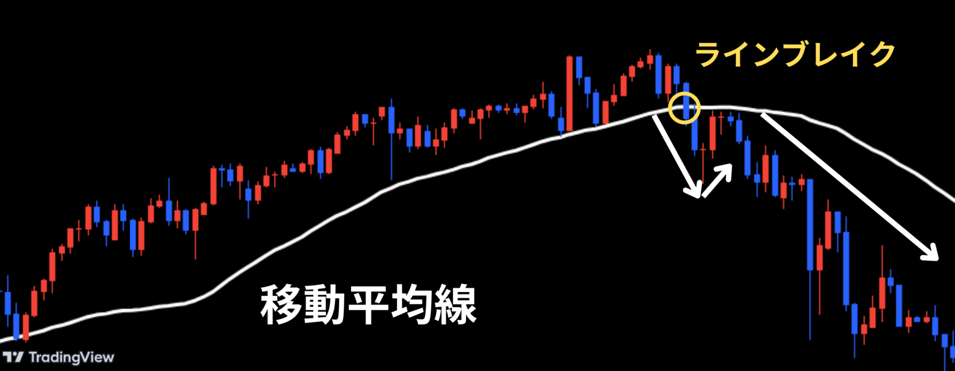 何度か移動平均線で反発する中でライン(移動平均線)ブレイクが発生し、ブレイク後にチャートが再び移動平均線に戻る形でリターンムーブが発生します。