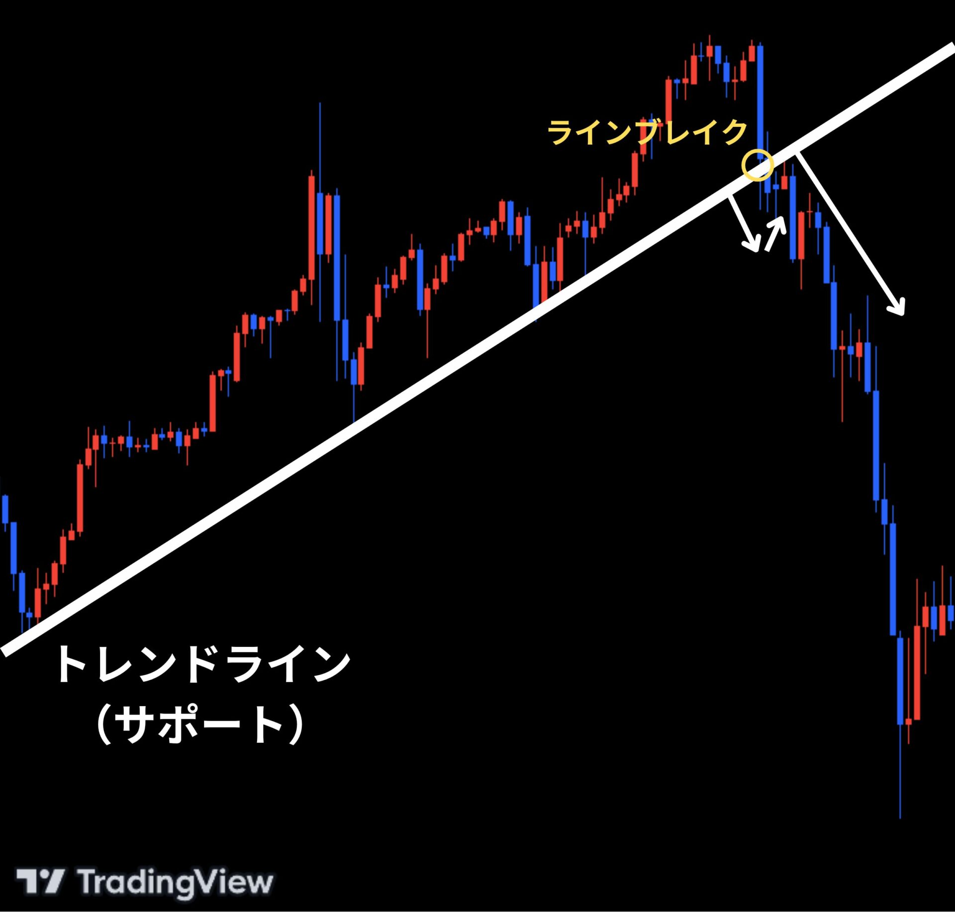 上昇トレンドの場合、サポートラインとして機能していたラインをチャートがブレイクし、ブレイク後にチャートがサポートラインに戻る形でリターンムーブが確認できます。